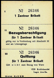 Braunkohklen-Briketts - VEB Kohlehandel Aue - 1 Zentner Brikett mit Bezugsberechtigung | ||||||||||||