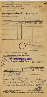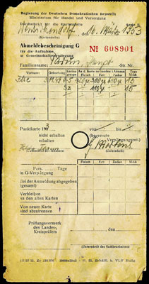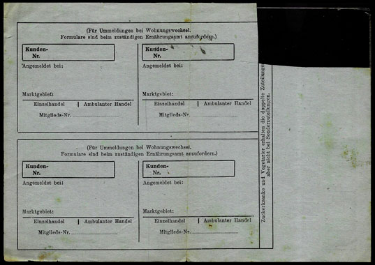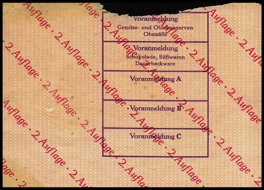 Bei Abwesenheits-Zeiten vom Wohnort (zum Beispiel Krankenhaus, Kinderferienlager, in Betrieben u.ä.) wurden von diesen Einrichtungen Lebensmittelabschnitte zur Verfügungg gestellt. Die am Ende des Aufenthaltes nicht genutzten Marken mussten zurückgegeben werden und wurden auf den Rückseiten der "Abmeldebescheinigungen" aufgeklebt |