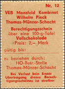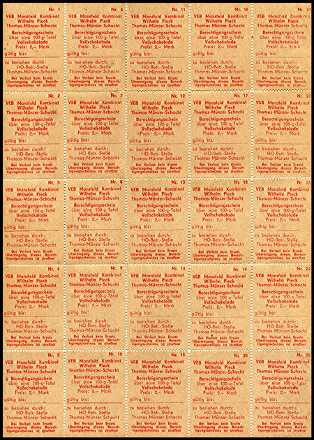 Sonderversorgung VEB Mansfeldkombinat "Wilhelm Pieck" - Bogen mit 31 Anspruchsmarken VOLLSCHOKOLADE - je 100 g Tafel = 2 Mark | |||||||