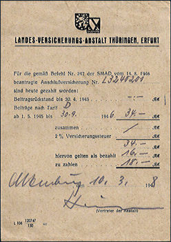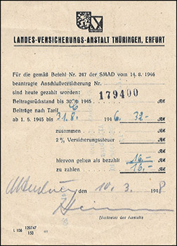 Nach den Vorgaben der sowjetischen Besatzungsmacht konnten Beiträge bestehender Lebensversicherungen ab 1. Mai 1945 nachgezahlt werden. Hier ein "Erster" Nachzahlbetrag für den Zeitraum vom 01.05.1945 bis zum 31.08.1946 |