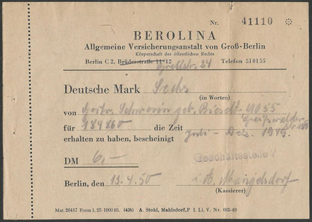 Beitragsquittung der Vereinigten Großberliner Versicherungsanstalt (voher BEROLINA) - Beitrag mtl. 1 DM - Die Versicherungsart ist nicht ersichtlich | ||||||||